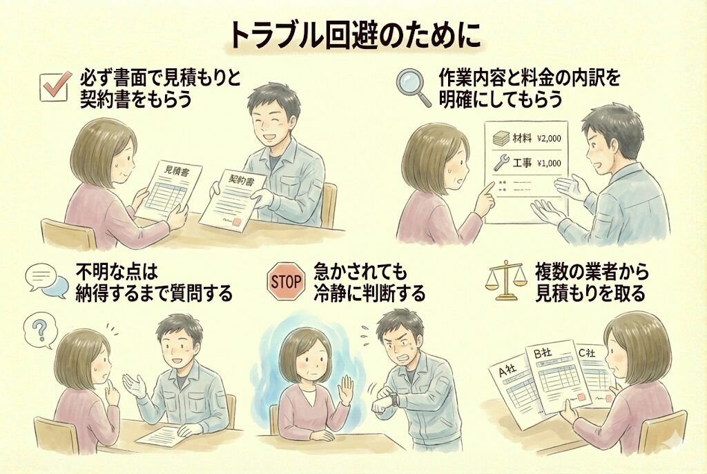 「今日中に契約すれば割引」「台風が来る前に」などと契約を急がせる業者は避けるべきです。冷静に判断する時間を与えないのは、悪質業者の常套手段です。