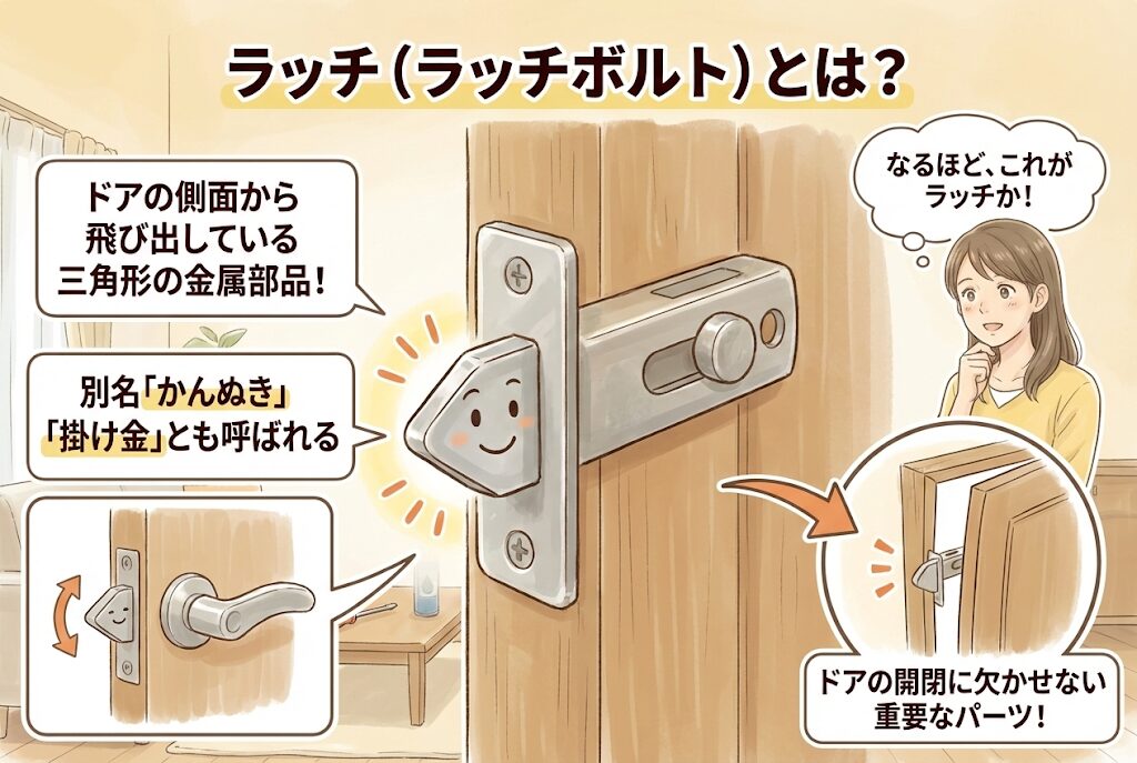 ラッチ(ラッチボルト)とは、ドアの側面から飛び出している三角形の金属部品のことです。「かんぬき」や「掛け金」とも呼ばれ、ドアの開閉に欠かせない重要なパーツです。