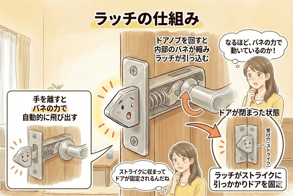 ドアノブを回すとラッチが引っ込み、手を離すと自動的に飛び出す仕組みになっています。ドアが閉まった状態では、ラッチがドア枠側の受け穴(ストライク)に引っかかることで、ドアを固定しています。