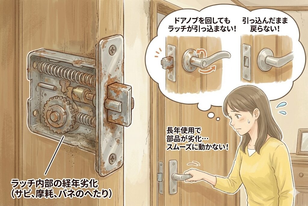 長年使用していると、ラッチ内部の部品が劣化し、スムーズに動かなくなります。ドアノブを回してもラッチが引っ込まなかったり、逆に引っ込んだまま戻らなかったりする症状が現れます。