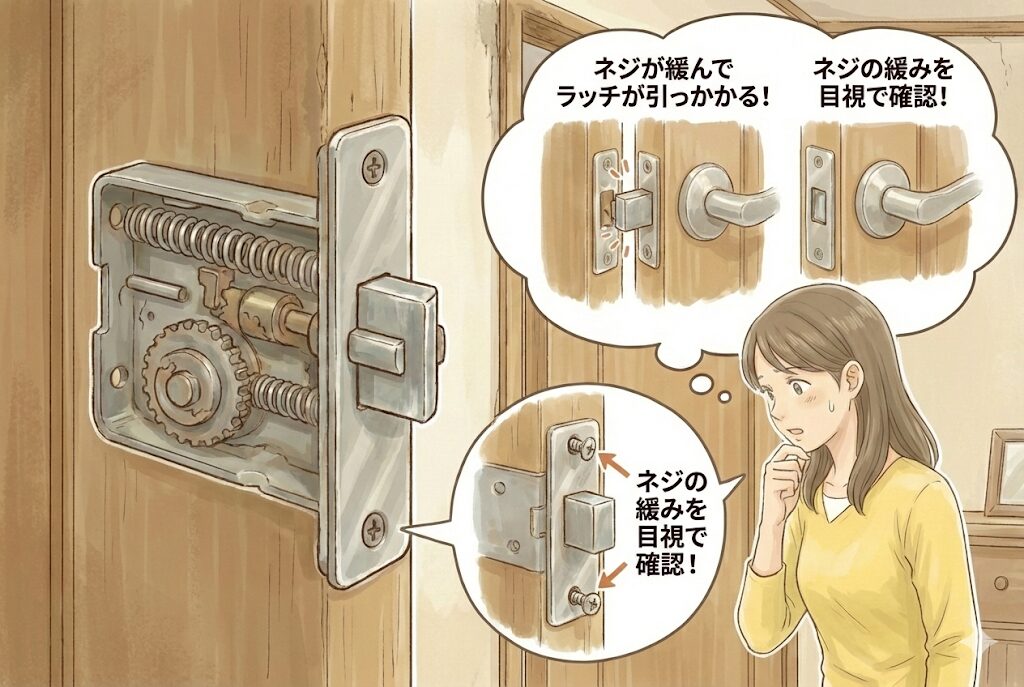 飛び出た部分がドア枠に引っかかり、ドアが閉まらなくなることがあります。ラッチ周辺のネジの緩みは、目視で簡単に確認できます。