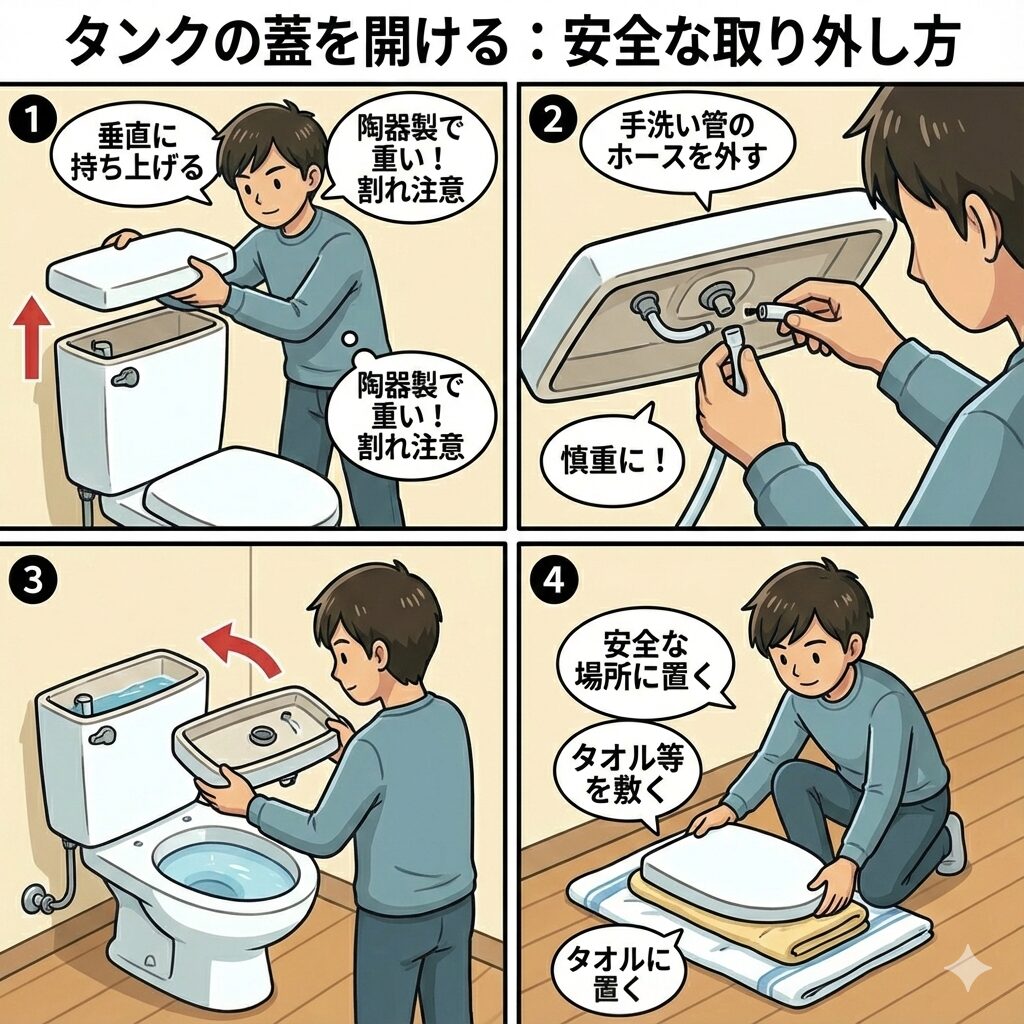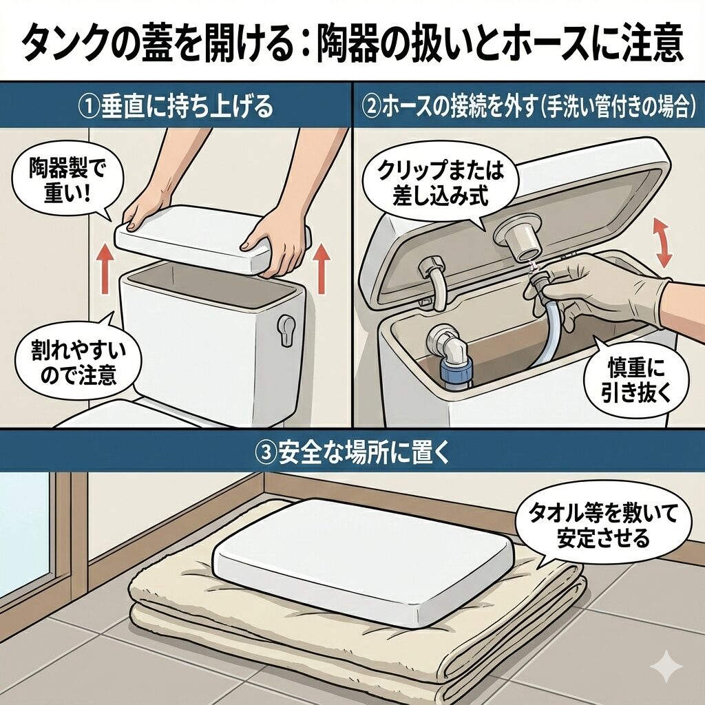 応急処置の時と同様に、タンクの蓋を垂直に持ち上げて外します。手洗い管のホースがある場合は注意して外し、蓋を安全な場所に置きます。