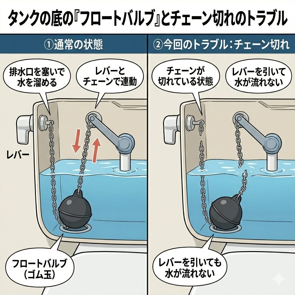 「トイレのレバーを回しても水が流れない!」 「タンクの中を覗いてみたら、チェーンが切れていた…」