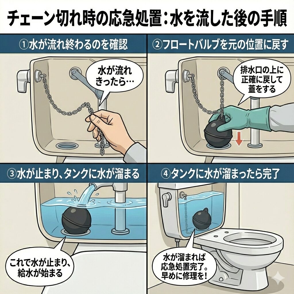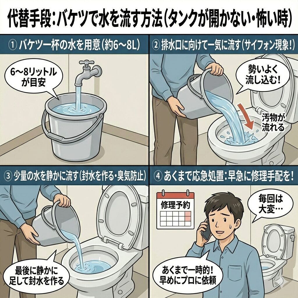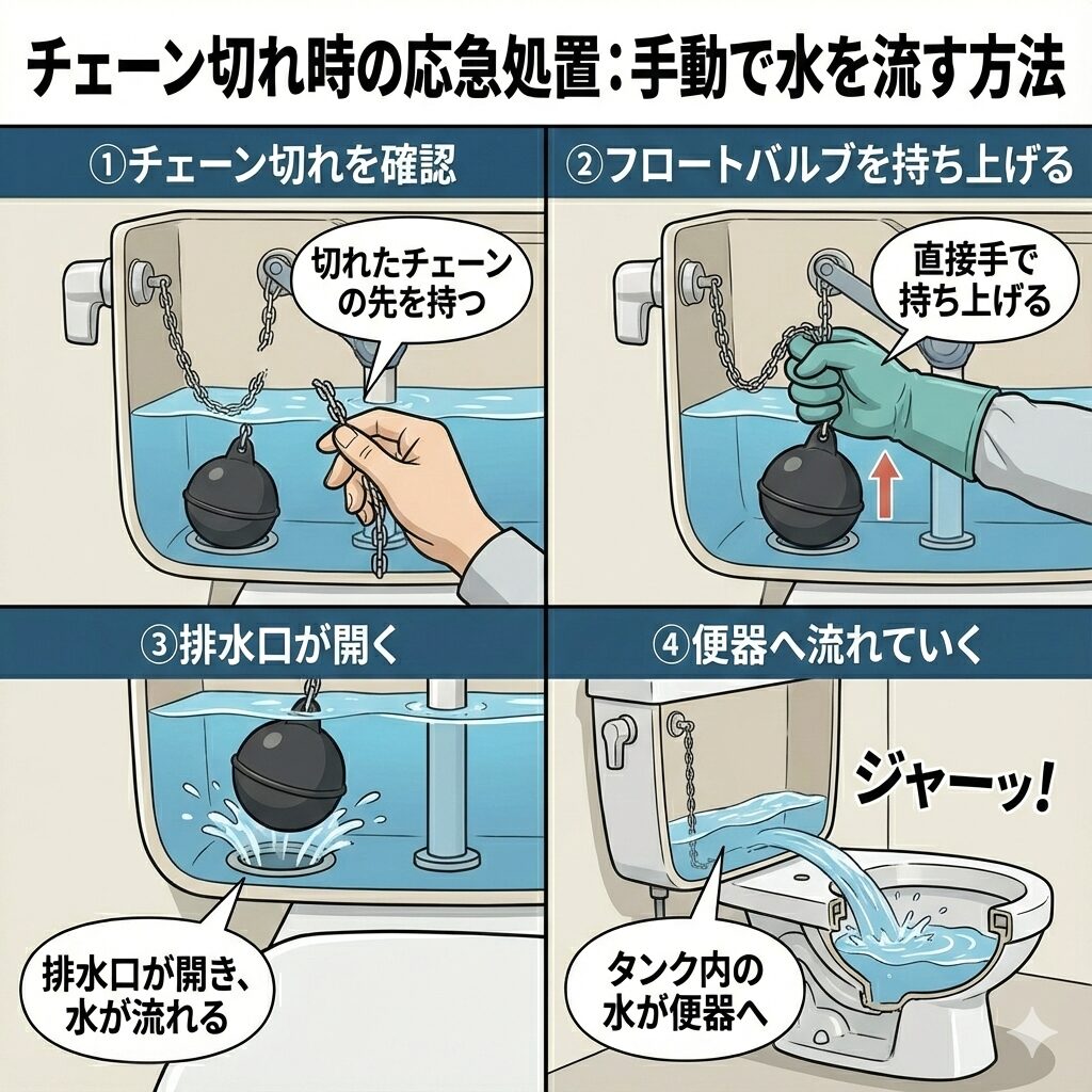 修理の手配や費用の話の前に、まずは「トイレの水が流せない」という緊急事態を解消しましょう。チェーンが切れていても、タンクの中に水が溜まっていれば手動で水を流すことは可能です。