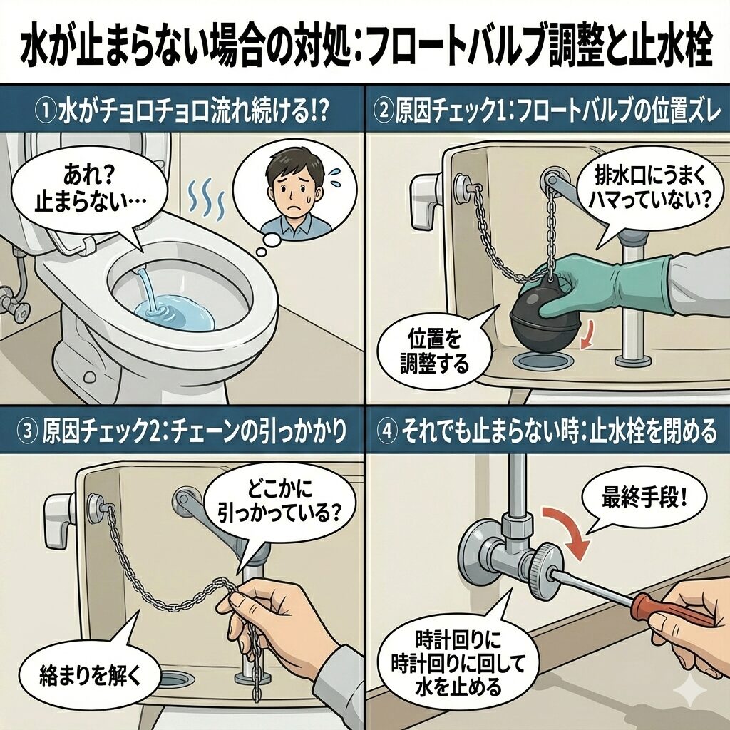 位置を調整してください。それでも止まらない場合は、トイレの壁や床にある「止水栓」をマイナスドライバーなどで時計回りに回して水を止めてください。