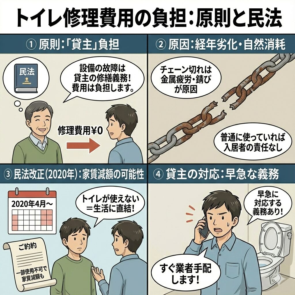 賃貸物件にお住まいの方にとって最も気になるのが「修理費用」でしょう。トイレのチェーンが切れた場合、費用は大家さん(貸主)が負担するのか、入居者(借主)が負担するのか、その基準を解説します。