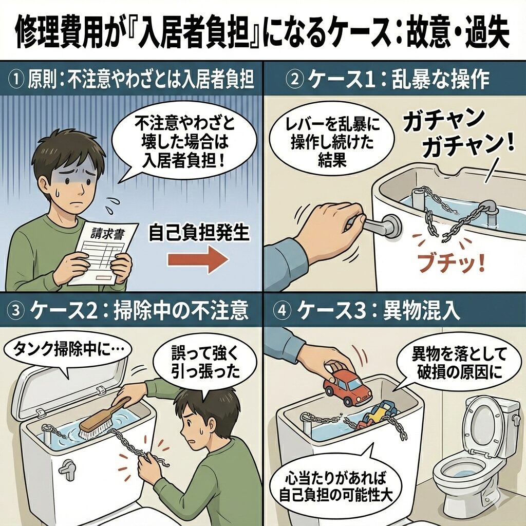 特にトイレのチェーン切れは、長年使用したことによる金属疲労や錆びといった「経年劣化」や「自然消耗」が原因であることがほとんどです。入居者が普通に使っていて起きた故障であれば、入居者に責任はありません。修理費用は大家さん側が負担するのが一般的です。