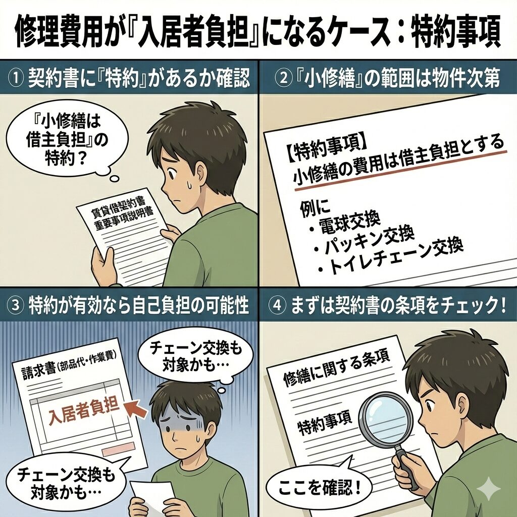 賃貸契約書に「小修繕(軽微な修理)の費用は借主が負担する」といった特約(特約事項)が記載されている場合があります。