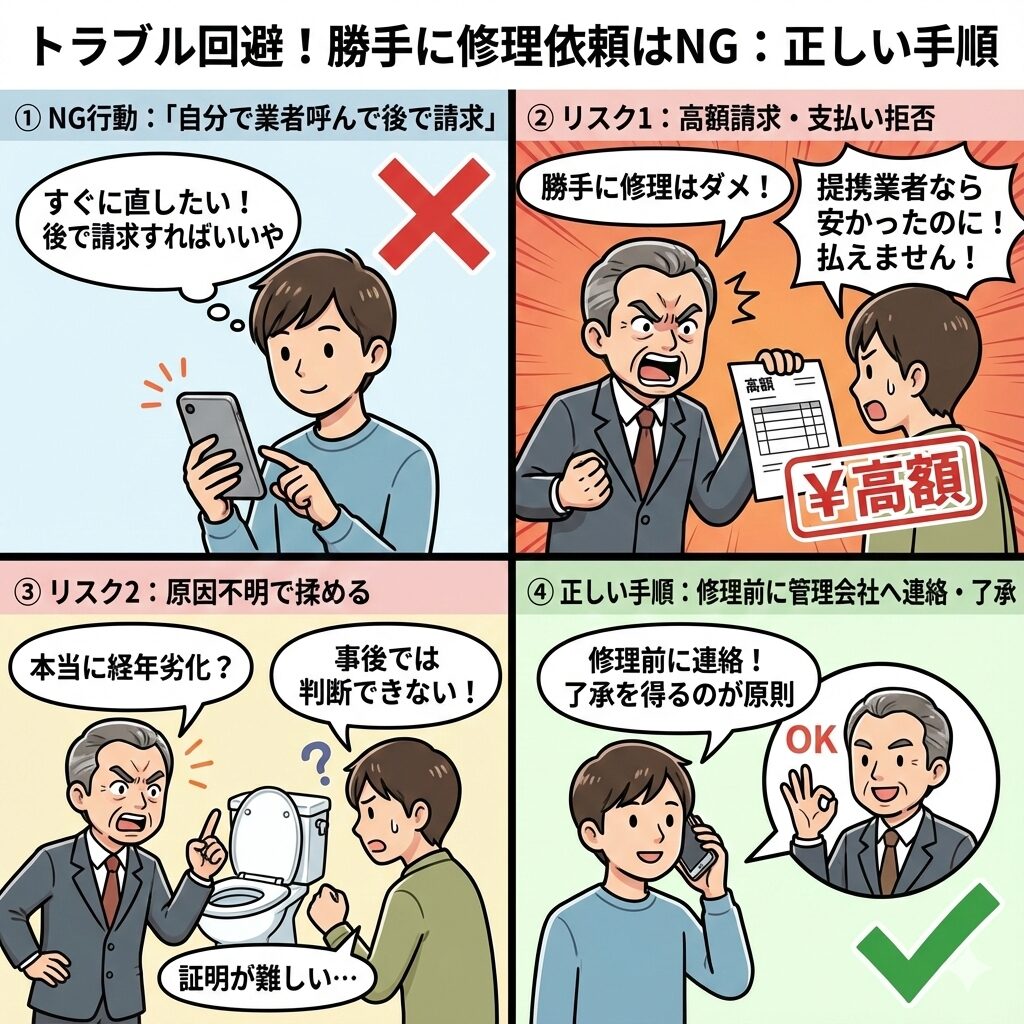 原則は「修理前に管理会社へ連絡し、了承を得ること」です。勝手に修理を依頼してしまうと、以下のようなリスクがあります。