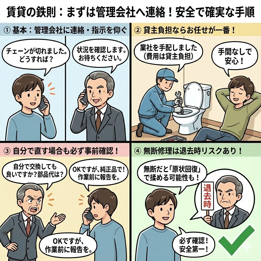 - 連絡が最優先:勝手に修理せず、必ず管理会社や大家さんに連絡して指示を仰ぐこと。
