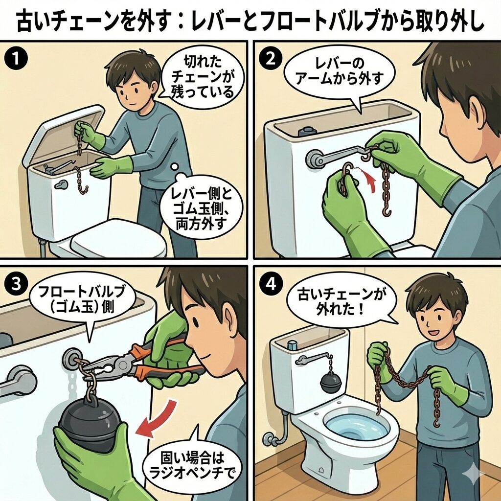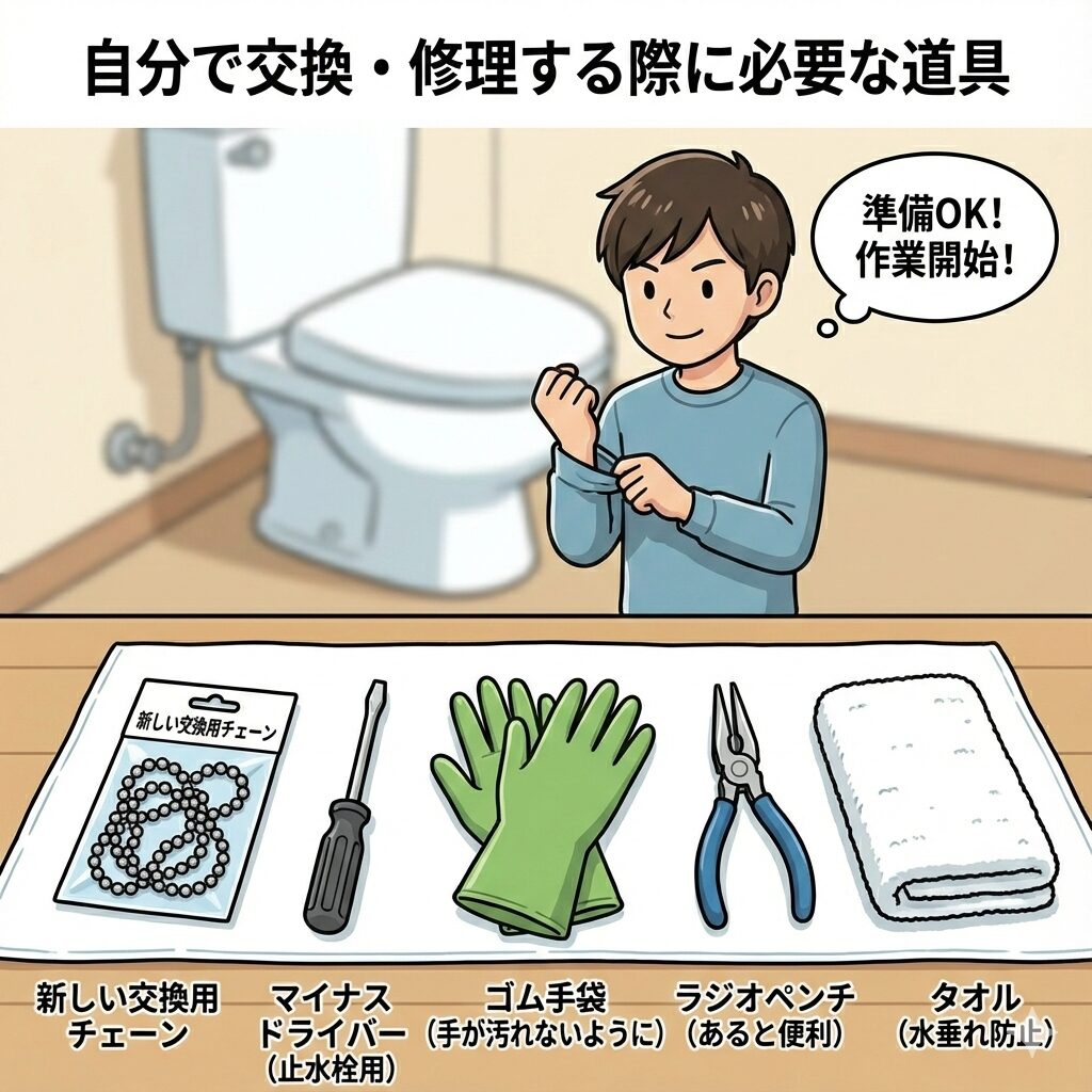 管理会社から「自分で修理してもOK」と許可を得た場合や、自己責任で直すと決めた方向けに、トイレチェーンの交換手順を解説します。作業自体はそれほど難しくありません。