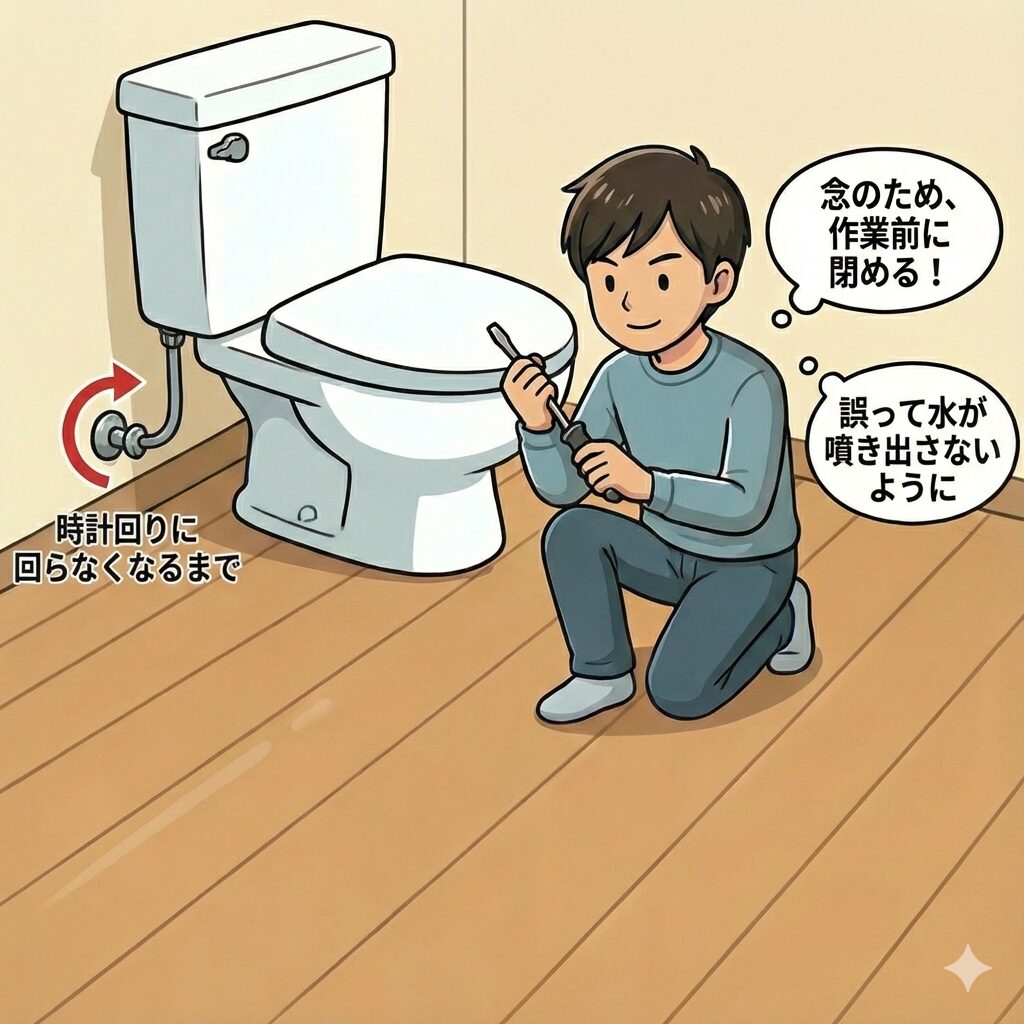 作業中に誤って水が噴き出さないよう、念のためトイレの止水栓を閉めます。壁や床からタンクにつながる給水管の付け根にある溝にマイナスドライバーを差し込み、時計回りに回らなくなるまで回します。