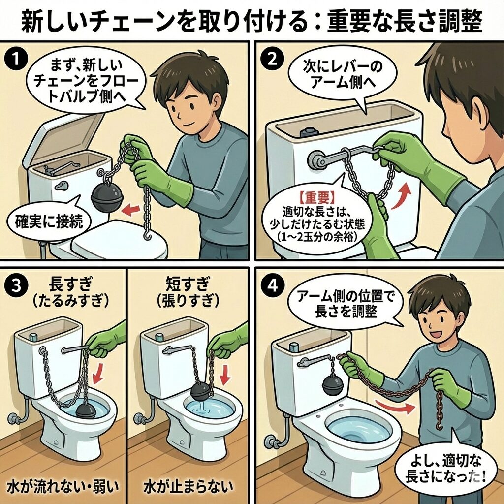 - 短すぎる(張りすぎ):常にフロートバルブが少し持ち上がった状態になり、水がチョロチョロと流れ続けて止まらなくなります。