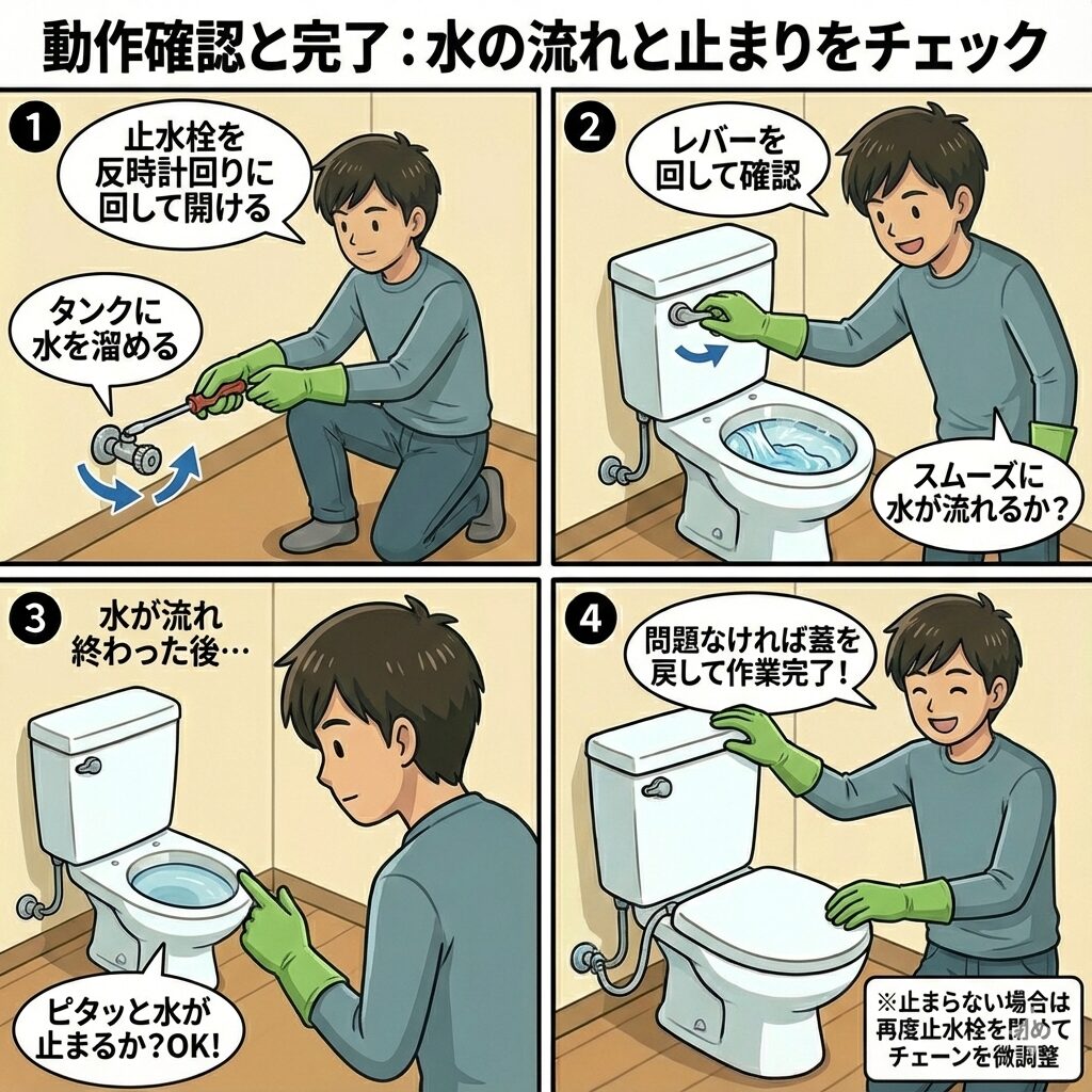 問題がなければ、タンクの蓋を元に戻して作業完了です。もし水が止まらない場合は、もう一度止水栓を閉めてチェーンの長さを微調整してください。
