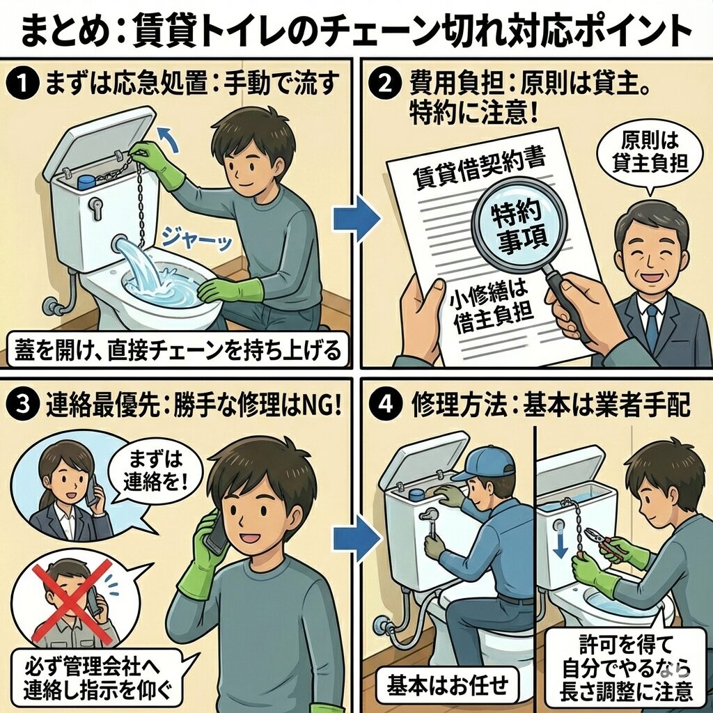 賃貸物件でトイレのチェーンが切れた場合の対応について解説しました。ポイントをまとめます。