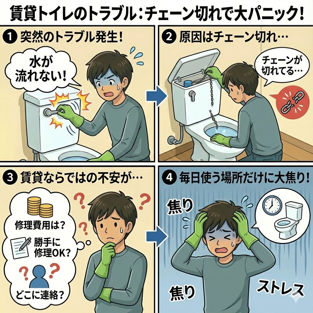 賃貸物件にお住まいで、突然トイレのチェーンが切れてしまい、どうすれば良いかお困りではありませんか?トイレは毎日使う場所だけに、水が流せない状況は非常にストレスですし、焦ってしまいますよね。