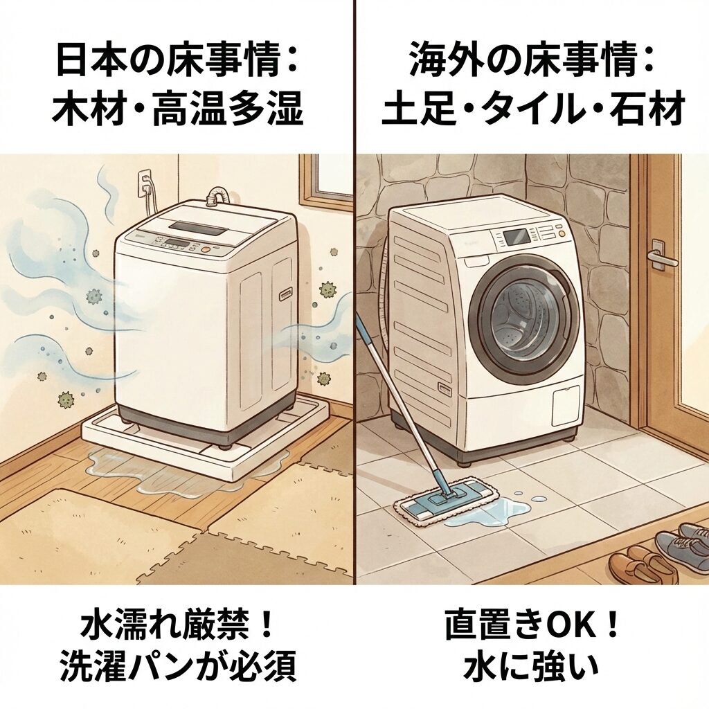 一方、日本の住宅は「木材」と「クッションフロア・フローリング」が主流。木は湿気に弱く、一度水を吸うと腐食やカビの原因になります。日本の高温多湿な気候も相まって「床を水から守る」ために洗濯パンが必須とされてきた歴史があります。