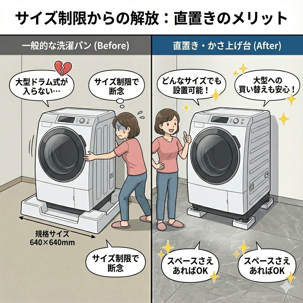 パンがなければ、スペースさえ許せばどんなサイズの洗濯機でも設置可能です。