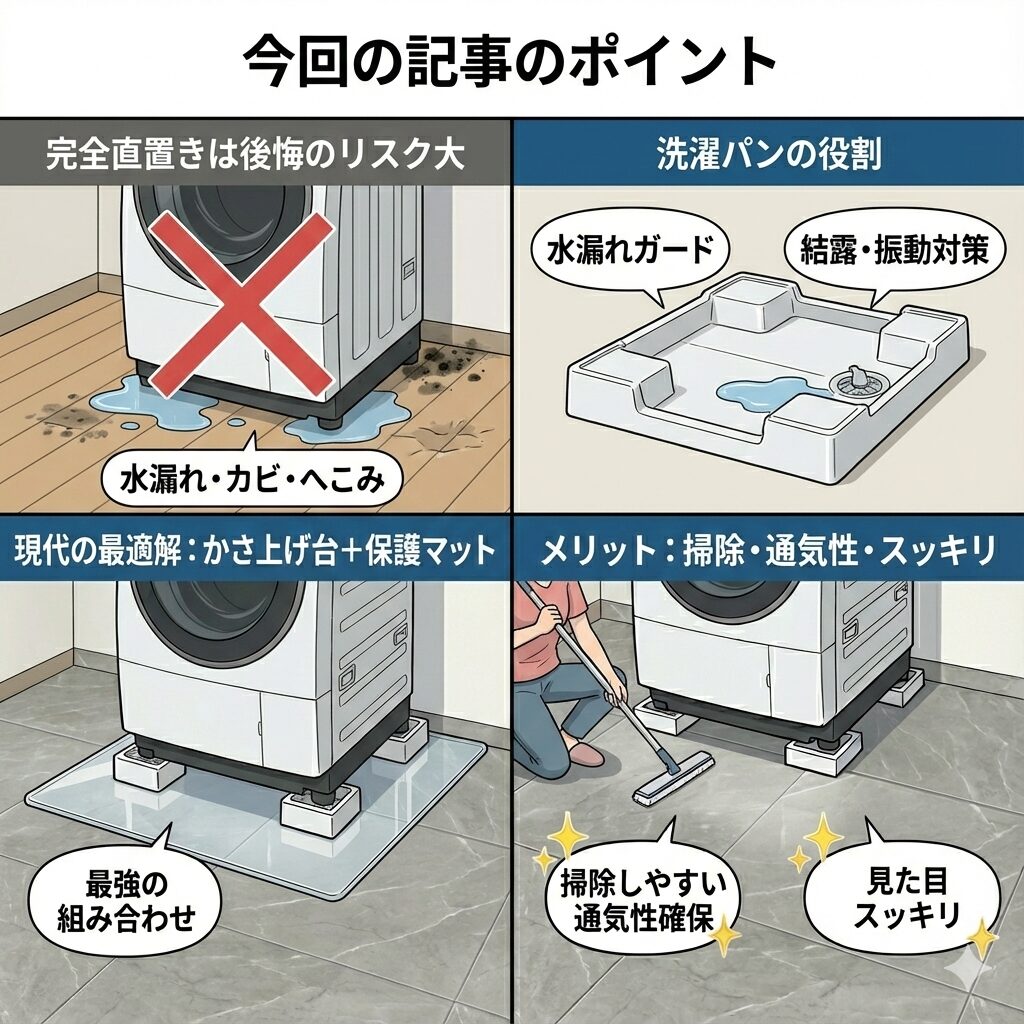 - 現代の最適解は、洗濯パンではなく「かさ上げ台(ふんばるマン等)」+「保護マット」の組み合わせ。