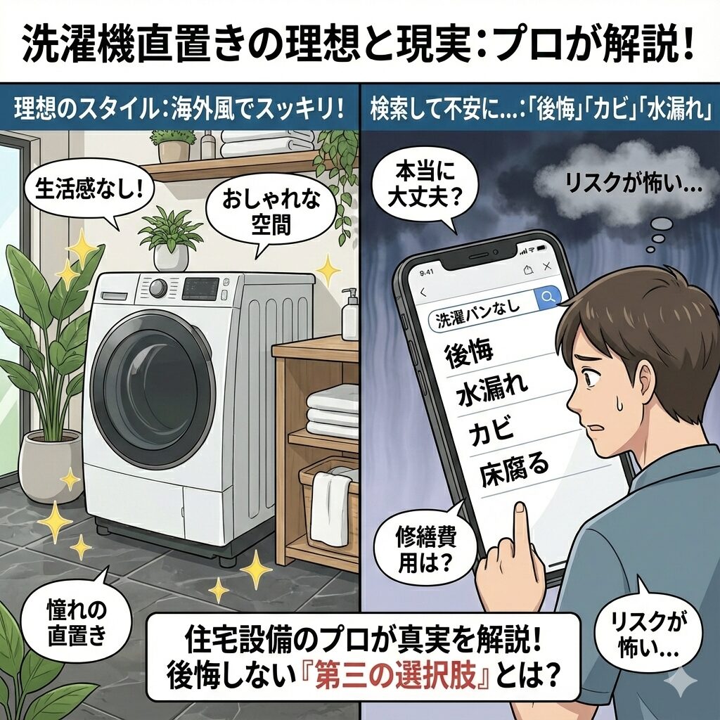 そんな不安を抱えているあなたへ。 この記事では、住宅設備のプロ目線で「洗濯機直置きのメリット・デメリット」を徹底解説します。さらに、直置きのリスクを回避しつつ、洗濯パンなしのスタイリッシュさを実現する「第三の選択肢」まで完全網羅します。