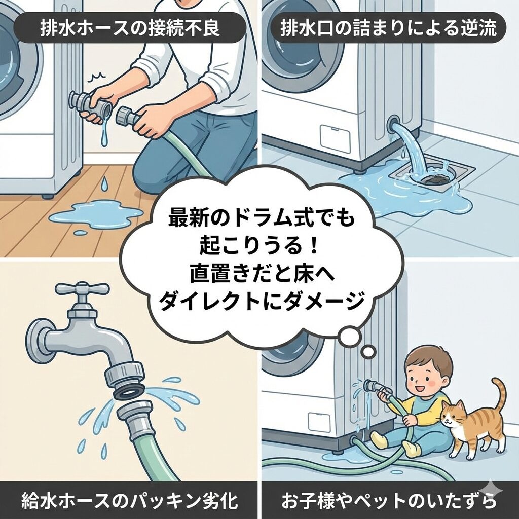 これらは、最新のドラム式洗濯機であっても起こり得ます。この「万が一」が起きたとき、直置きだと床へダイレクトにダメージがいってしまうのです。