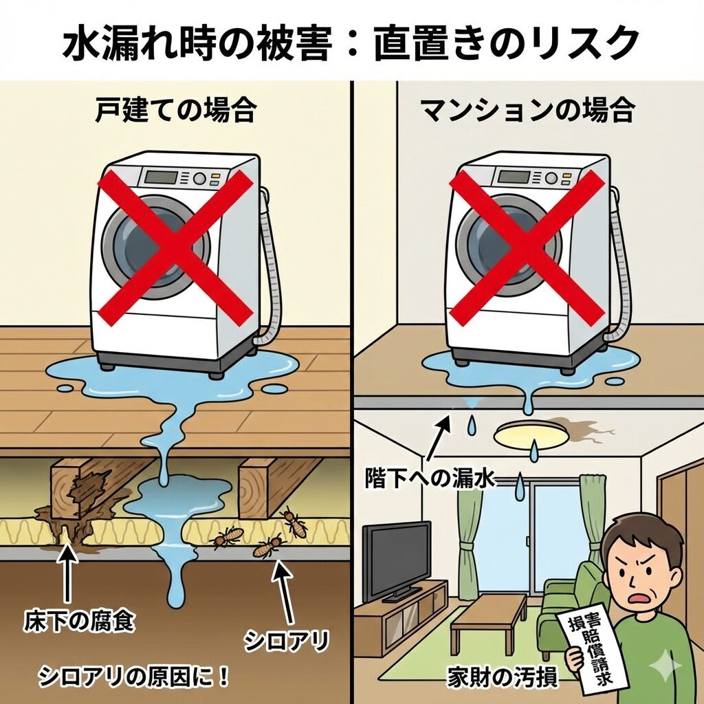 注意: マンションの管理規約で「洗濯パンの設置必須」となっている場合が多いのは、この階下漏水リスクを避けるためです。