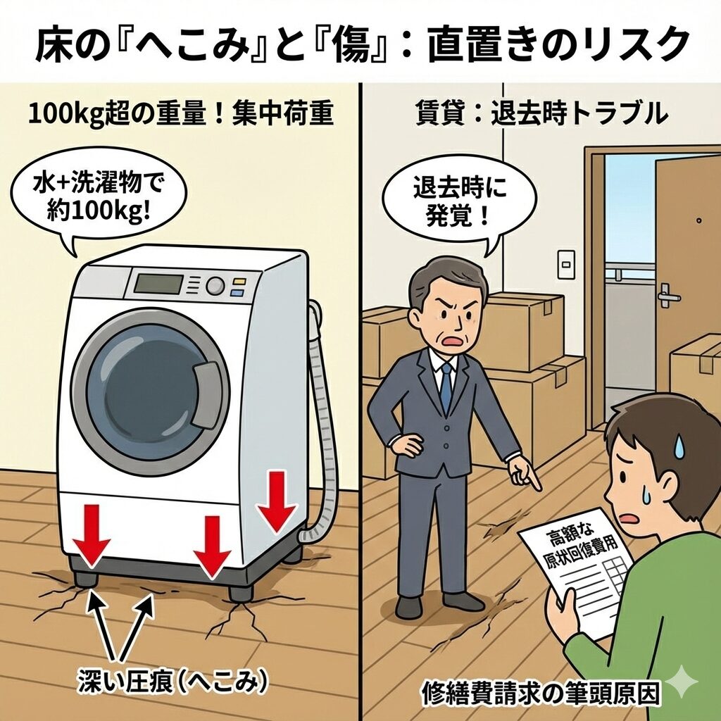 この重量を4本の脚だけで支えるため、直置きするとフローリングに深いへこみ(圧痕)が残ります。 賃貸物件の場合、退去時に高額な原状回復費用を請求される原因の筆頭です。