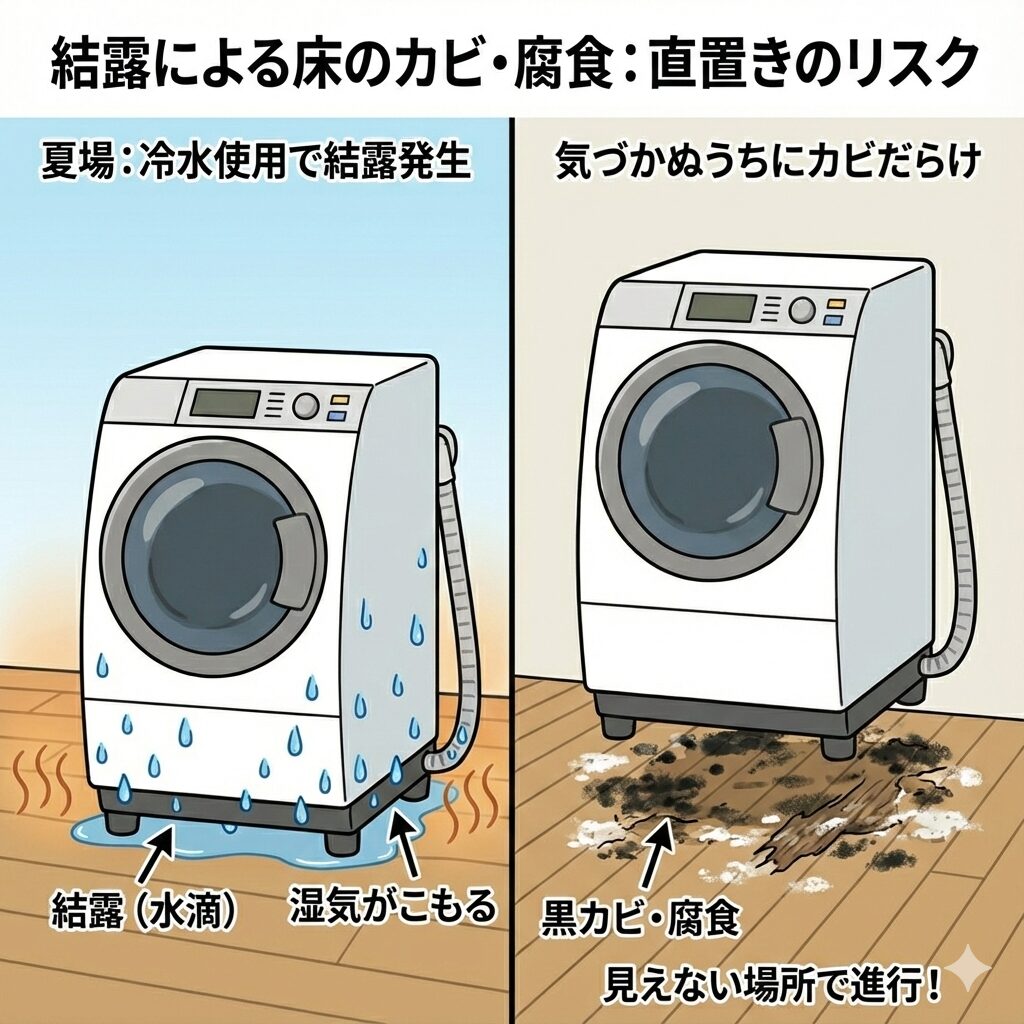 洗濯パンがあれば空気の通り道がありますが、直置き(特に底面が低い機種)の場合、床と洗濯機の間湿気がこもり、気づかないうちに床がカビだらけになっていることがあります。