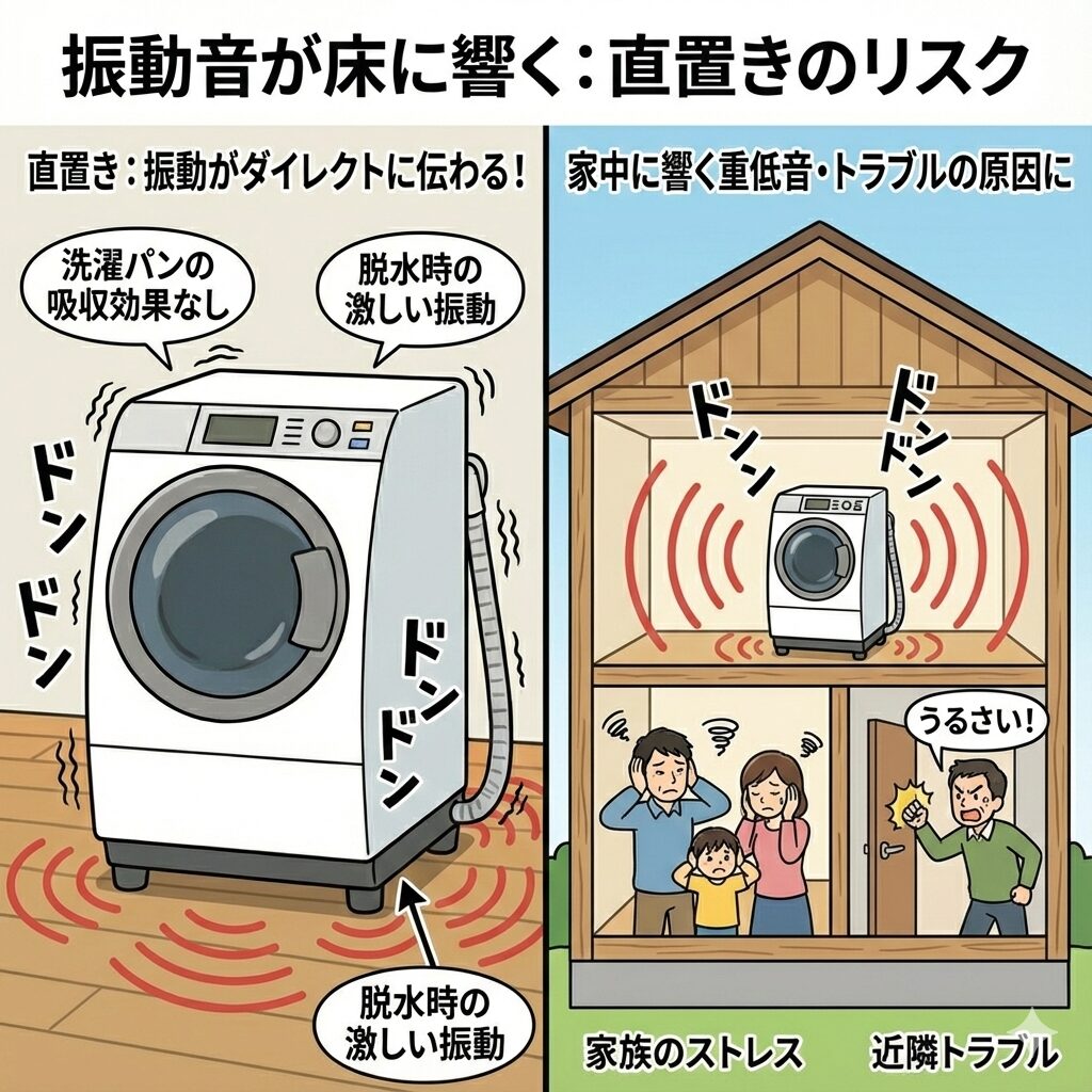 洗濯パンは、洗濯機の振動を吸収する役割も果たしています。 直置きの場合、脱水時の激しい振動が床材にダイレクトに伝わります。