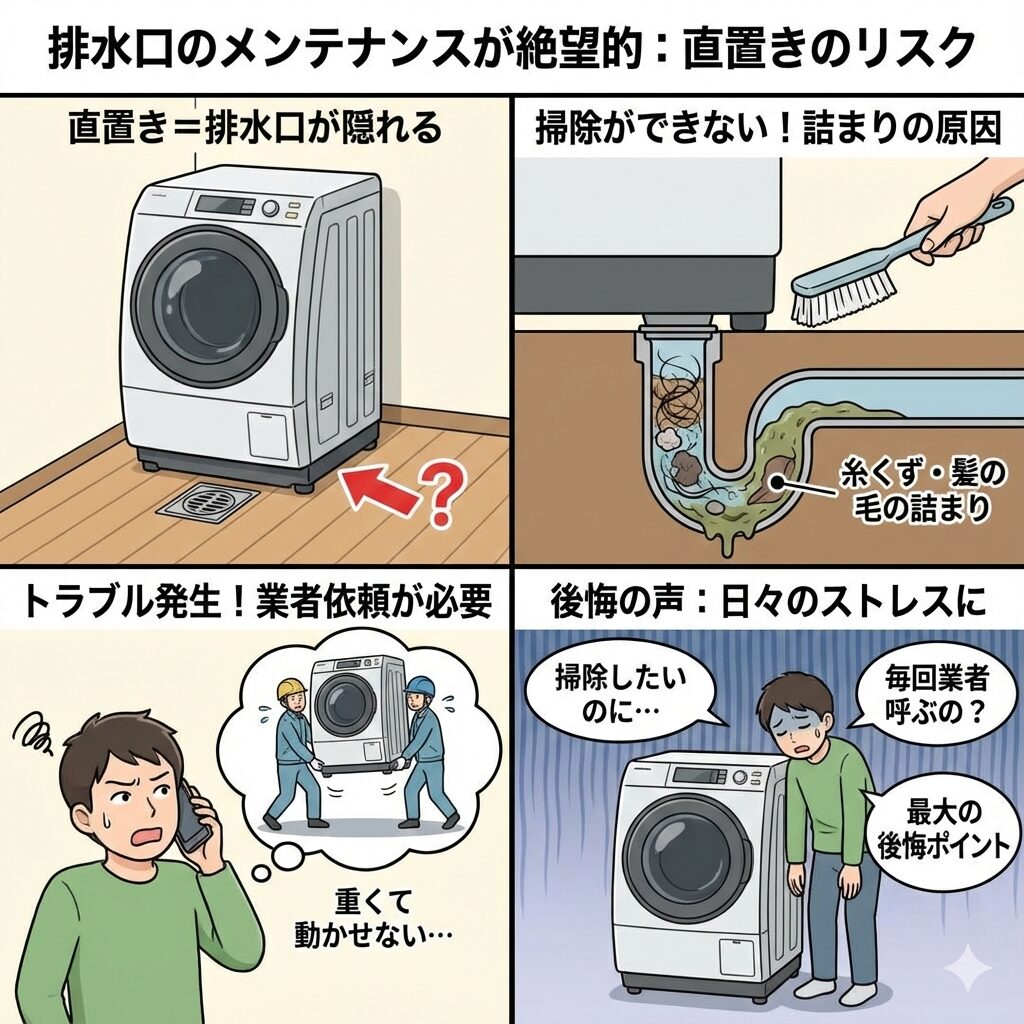 洗濯機を直置きしてしまうと、重い本体を動かさない限り、排水口の掃除ができません。 糸くずや髪の毛で排水トラップが詰まったとき、業者を呼んで洗濯機を持ち上げてもらう必要が出てきます。