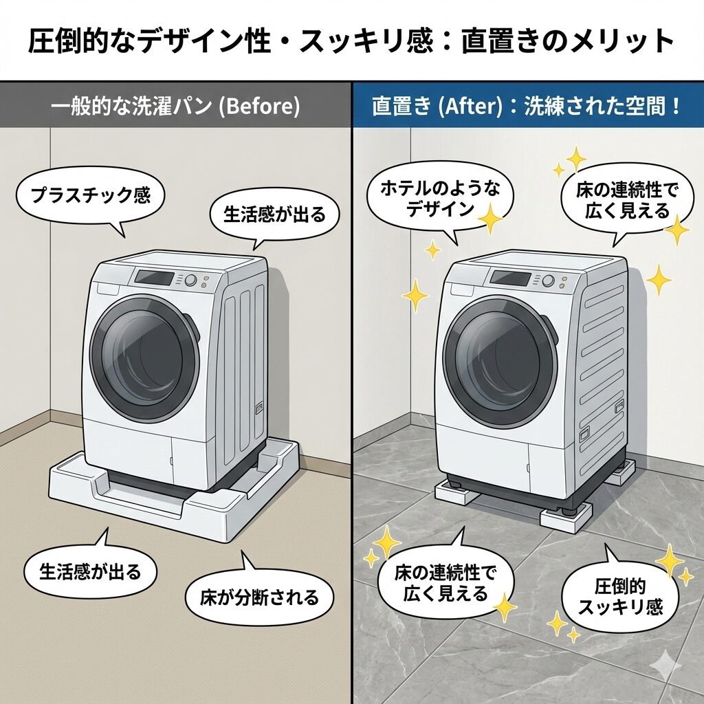 - 見た目がスマート: 洗濯パンのような圧迫感がなく、直置きに近いスッキリした見た目を維持できます。