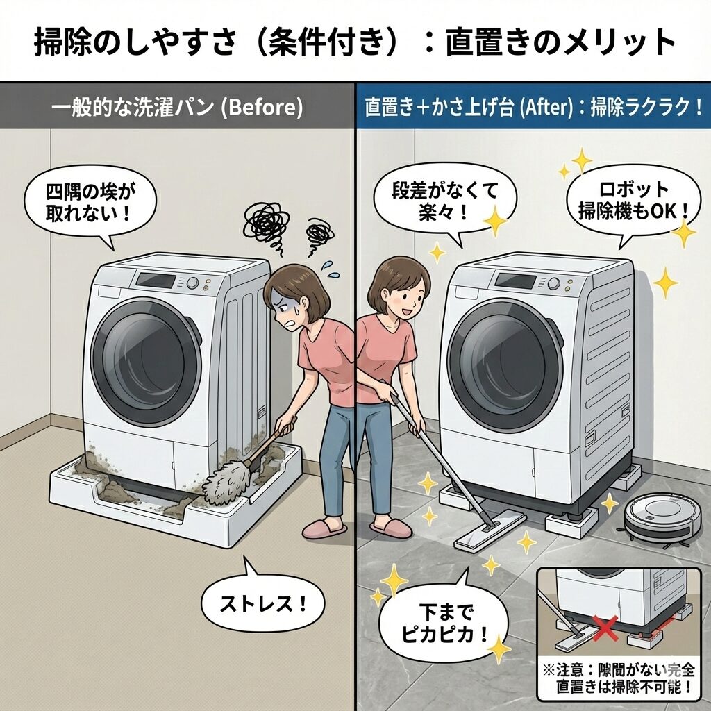 「洗濯パンの四隅の埃が取れない!」というストレスから解放されます。 クイックルワイパーやロボット掃除機が洗濯機の下に入り込めるスペースさえ確保できれば、パンの段差がない分、床掃除は非常に楽になります。