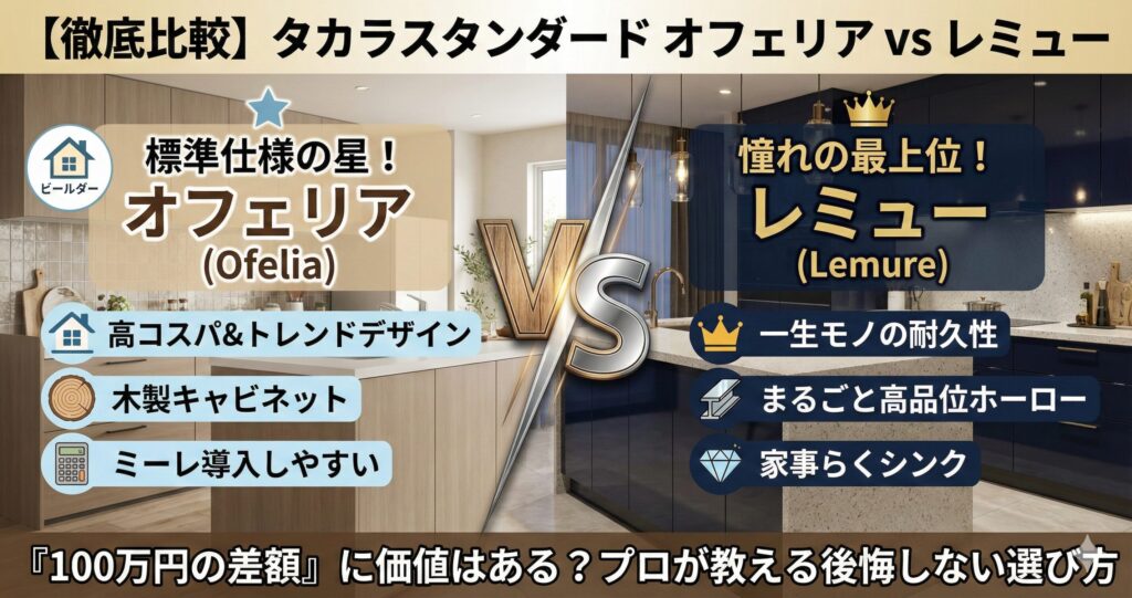 注文住宅や大規模リフォームの打ち合わせ中、誰もが一度は憧れるタカラスタンダードの最上位モデル「レミュー(Lemure)」。 しかし、見積書に最初に入っている標準仕様は、多くの場合「オフェリア(Ofelia)」です。 カタログを見比べると、レミューの重...