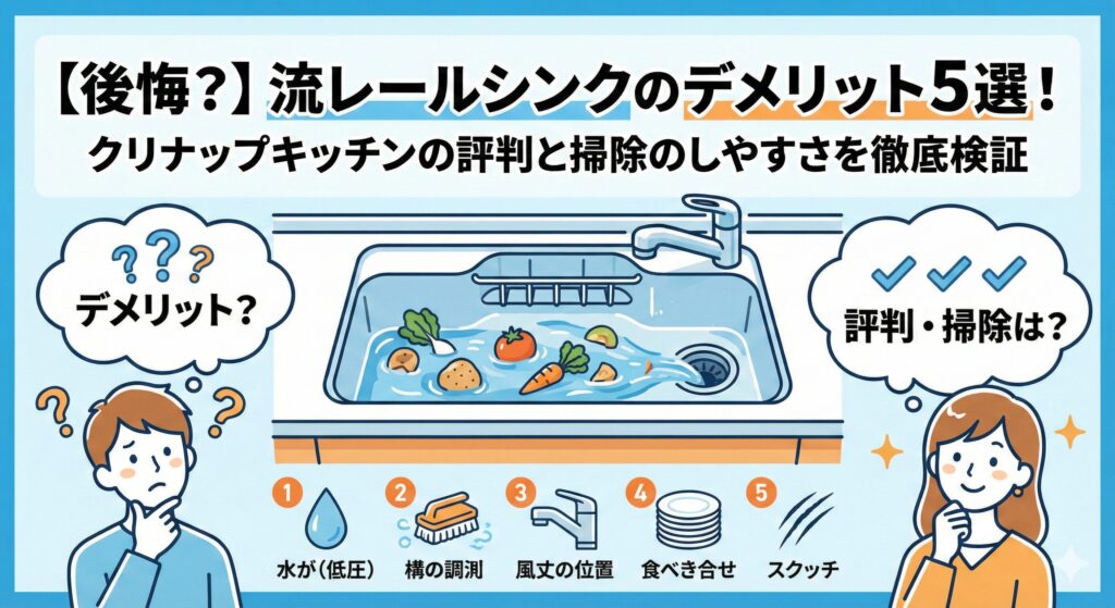 新しいキッチン選び、ワクワクしますよね。中でもクリナップのシステムキッチン(ステディアやラクエラなど)を検討する際、必ず目にするのが「流レールシンク」です。 「水を使うだけでゴミが勝手に流れていくなんて魔法みたい!」 そう思う一方で、こん... -