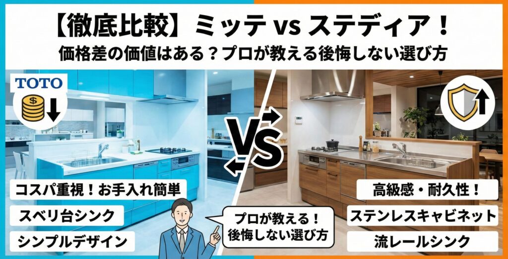 「キッチンのリフォームで迷っています。TOTOのミッテと、クリナップのステディア、どちらが良いでしょうか?」 これは、リフォームの現場で非常に多く聞かれる質問です。 しかし、プロから見るとこの2つは「全く異なる土俵の戦い」です。 TOTO「ミッテ (m... -